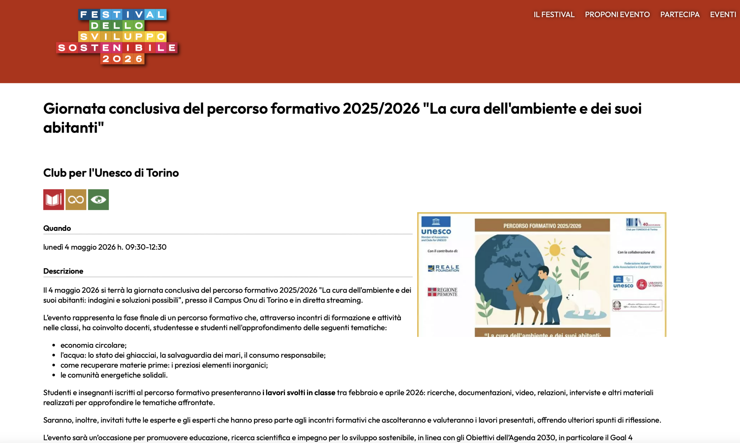 Il 4 maggio 2026, ore 9:15 – 12:30, presso il Campus ONU di Torino, si terrà la Giornata Conclusiva del Percorso Formativo 2025/2026 “La cura dell’ambiente e dei suoi abitanti: indagini e soluzioni possibili”.